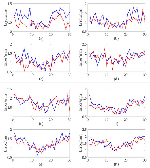 The measurement errors of the two calibration methods (the blue line represents the conventional method and the red line represents the novel method). (a) The experimental results of A area; (b) The experimental results of B area; (c) The experimental results of C area; (d) The experimental results of D area; (e) The experimental results of E area; (f) The experimental results of F area; (g) The experimental results of G area; (h) The experimental results of H area.