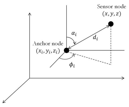 We assume there are N anchor nodes and one unknown node in a 3D WSN, where the locations of the anchor nodes are denoted by and the location of the unknown node is denoted by , as illustrated in Figure 1. We also assume the anchors are equipped with hybrid RSS-AoA antennas. Thus, the combined measurements are given by:
