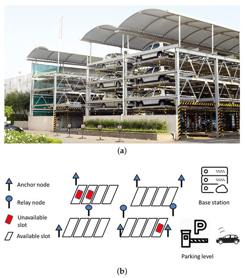 Example of an intelligent vehicle parking system. (a) A typical multi-level parking site [24]; (b) Infrastructure at a single layer.