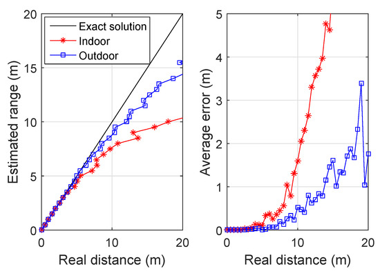 Figure 3 shows an example of distance estimation in indoor (PLE = 1.5 and additional reflection coefficients) and outdoor (PLE = 3.5) environments. Other parameters are given in Section 4. In each run, the estimated range was obtain from (6) and the quantization process. The coordinate of a single target was randomly generated for the given area. It has been shown in [3] that the relation between the average received power and the distance is proportional. The estimated range was obtained from the raw measurements over 100 realizations. We observed that in the outdoor environment the quantized scheme performed more stably and had smaller errors compared to the indoor space. This is because the wireless signals in the indoor environment suffered from multipath and reflection effects from walls and obstacles. In addition, the results provided a clue that could help in choosing an appropriate quantization level. A good accuracy of about 1 m average error within a range of 10 m can be achieved, which is acceptable for ranging with inexpensive devices.