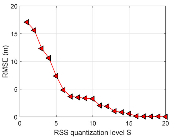 In order to first find an appropriate threshold for the RSS measurements, we investigated the effect of the RSS quantization level on the RMSE performance. Without loss of generality, we set and . One of the basic choices in selecting the quantization level is the number of anchors. As Figure 4 illustrated, the higher quantized level S resulted in a lower RMSE value. However, the RMSE performance was not improved by increasing the quantization level S. This is because when S becomes large, there is not much difference among the quantized intervals, and boosting error can increase with S, especially when the measurements are noisy. We also observed that the value of quantized level had a significant impact on the performance of the estimated range (6). A small value S reduced the localization expense, but degraded the localization accuracy. When S approached infinity, the estimator in (10) was actually reduced to the conventional weight least squares method with the bias-reducing constant (8). Thus, with a refinement scheme to exploit the above tradeoff, the proposed localization scheme worked well under the condition settings. With an acceptable RMSE, we chose for the next simulation results.