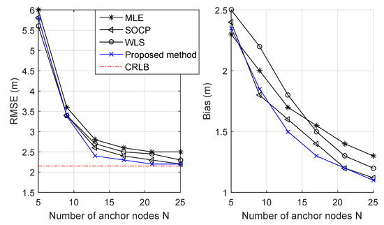 In Figure 5, we evaluate the RMSE with different numbers of anchor nodes N where (i.e., noiseless measurements). When the number of anchor nodes N increased, the RMSEs of all estimators decreased significantly and converged to the CRLB. With a fixed number of anchor nodes, the proposed estimator achieved an acceptable RMSE and smaller bias compared to the others.