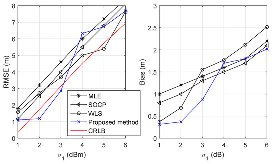 Figure 7 shows the RMSE and the bias versus when dBm. From this figure, we observe that the proposed method still had a good performance when the noise became large. The bias performance was comparable to the MLE and SOCP and much lower than the WLS. However, it was also acceptable since the proposed method had a lower complexity than the MLE and SOCP estimator.