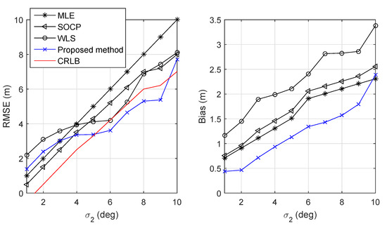 Figure 6 illustrates the RMSE and the bias versus when deg and . We observed that the proposed scheme achieved a comparable RMSE and smaller bias when was small compared to other methods. When became large, even our solution had a lower RMSE, but higher bias. This phenomenon may occur from the approximations of the linearization process explained in Section 3.5.
