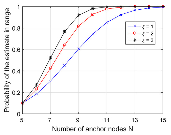 We now investigate the effects of the GDoP in the network localization. For a given bound , we calculated the probability of GDoP smaller than , which means the probability of acceptable estimation . The exponential increase in the detection probability as we took more measurements from the anchor nodes is illustrated in Figure 8, which plots the performance predicted by (27) for a range of with the number of anchor nodes N. The results are consistent and should approach one exponentially fast as N and are increased.