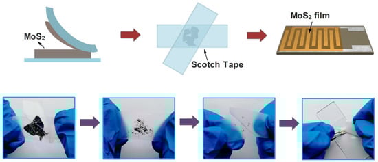 In recent years, transition metal dichalcogenides (TMDs) have attracted much interest due to their unique layered structure, electronic and energy storage properties, which can be exploited in numerous devices such as sensors, field-effect transistors and supercapacitors [1,2,3,4]. MoS2, as the frontrunner in the TMDs family, has also been extensively investigated as a potential gas-sensing material because of its tunable band gap, large surface-to-volume ratio, and various active sites [5,6,7]. Gas-sensing properties are closely related to the size of the gas-sensing materials. According to reports, all electrons inside the gas sensing channel can be affected by the adsorbed gas when the grain size is smaller than two times the Debye length (so-called grain-size control). The space-charge layer then penetrates into the whole sensing channels, and the response is drastically promoted [8,9]. Structurally, MoS2 is a layered material in which S-Mo-S atoms are closely packed in a hexagonal arrangement, and each neighboring layer is connected by van der Waals forces [10]. Due to the strong intra-layer interactions and the relatively weak interactions between these layers, the synthesis of single or few-layer MoS2 nanosheets (FLMN) becomes possible by mechanical exfoliation from bulk MoS2 [11,12]. With this method which is the easiest and fastest way to produce the pristine, highly crystalline and atomic thickness layered materials [13], single or few-layer MoS2 nanosheets can be obtained without introducing too many defects. Compared with single-layer MoS2, few-layer MoS2 exhibits much higher electronic mobility due to lower Schottky barriers, which makes it more attractive for gas sensing [14,15,16]. Moreover, it is reported that the physical adsorption of gas molecules on MoS2 surface can overcome the shortcoming of difficult desorption from two-dimensional materials [17], which is beneficial to improve the recovery characteristics of gas sensors. Hence, the FLMN prepared via mechanical exfoliation show great potential in fabricating high-performance NO2 gas sensors.
