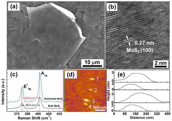 In order to further verify the few-layer microstructure of MoS2 nanosheets, SEM, TEM, Raman spectra and AFM images of MoS2 nanosheets are shown in Figure 2. From Figure 2a, a sheet with a smooth surface is observed on the substrate, and the sheet surface shows the same pattern as the substrate, which looks transparent. This phenomenon, that the fuzzy pattern of the substrate reveals on the sheet surface, can be mainly attributed to the fact that the thickness of the sheet is thin enough to allow the electron beam to penetrate through it at the acceleration voltage of 30 kV, resulting in the reception of signals from the substrates. A high-resolution TEM (HRTEM) image is shown in Figure 2b, and a lattice fringe spacing of 0.27 nm corresponding to the crystal planes (100) of MoS2. The ordered lattice arrangement of MoS2 indicates that MoS2 has good crystallinity [22]. In Figure 2c, Raman spectra of bulk MoS2 and exfoliated MoS2 nanosheets are shown as measured using a 532 nm laser at room temperature of 25 °C. Two characteristic vibration modes can be observed in the spectrum of bulk MoS2, the in-plane E12g mode at 381.8 cm−1 results from opposite vibration of two S atoms with respect to the Mo atom while the A1g mode at 407.3 cm−1 is associated with the out-of-plane vibration of only S atoms in opposite directions [23,24]. Generally, the frequency difference (Δ) of the two dominant modes can be used to estimate the number of MoS2 layers [25].