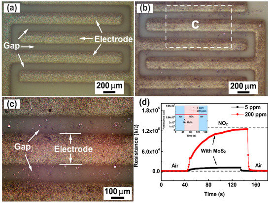 The optical images of the gas sensor without and with FLMN are displayed in Figure 3a–c. The blank Al2O3 ceramic substrate with Ag-Pd interdigital electrodes is clearly seen in Figure 3a, and the bare gap is quite clean without any materials. From Figure 3b,c, the FLMN with metallic luster are randomly dispersed on the Al2O3 ceramic substrate with interdigital electrodes, and the interlaced MoS2 nanosheets are bridged between the adjacent electrodes, which form the sensing channels on the gap. In order to support the issue that the sensing channels are composed of bridged MoS2 nanosheets, gas sensors with and without FLMN were exposed to 5 and 200 ppm NO2 at room temperature and their response and recovery behaviors are shown in Figure 3d. It can be seen that the resistance of the gas sensor coated with FLMN increases upon injection of NO2 and that it returns to its original value after removing the NO2. The higher the concentration, the larger the resistance change. The resistance responses of the uncoated gas sensor to 5 and 200 ppm NO2 are shown in the inset of Figure 3d. No matter whether the uncoated gas sensor is exposed to 5 ppm NO2, 200 ppm NO2 or air, there is no change in the resistance, and its resistance is much higher than the resistance of the gas sensor coated with FLMN. These results prove that bridging MoS2 nanosheets between adjacent electrodes form a conduction channel that reduces the resistance of the coated gas sensor below its resistance before coating. The observed NO2 response patterns can, therefore, be ascribed to the MoS2 nanosheets.