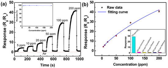 The FLMN gas sensor was repeatedly exposed to gas pulses with concentrations ranging from 5 to 200 ppm NO2, separated by periods of fresh air in between. The resulting transient response-recovery curve of the FLMN gas sensor is shown in Figure 4a. The resistance of the gas sensor gradually increases with the NO2 concentrations as it is exposed to NO2, implying that the N-type response behavior of MoS2 nanosheets is found in the detection of NO2. According to this figure, the response of the gas sensor continuously increases as the NO2 concentration is ramped up from 5 to 200 ppm at room temperature, and the responses are about 4.4, 6.1, 9.3, 15.8, 29.1 and 41.7 corresponding to 5, 10, 20, 50, 100 and 200 ppm NO2, respectively. After removing the NO2 from the gas sensor, the resistance of the gas sensor can return completely each time with almost no drift. The recovery behavior is very fast and recovery time constants are as short as 2–4 s. As the MoS2 gas sensors reported in the previous works often fail to recover [28,29,30], the degree of recovery is an important indicator of the quality of the gas sensor. Herein, the recovery characteristic of the MoS2 gas sensor is investigated by calculating the recovery rate, defined as follows [31,32].