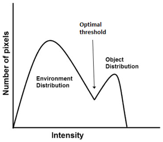 In this paper, we present an alternative direction, focusing on the development of algorithms based on smaller datasets. This research focuses on segmenting objects in the image using an adaptive thresholding method. Observing the histogram of the image color implies that a threshold can be determined to best differentiate between the background and the object distributions [42]. The threshold is computed by finding the histogram minimum (Figure 1) separating two peaks: the object and the background. However, the global minimum between the distributions is very hard to determine in most cases [43].