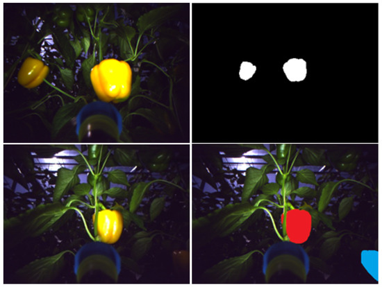 Peppers tagging example. Top: RGB image (left) and ground truth (right) example in high visibility. Bottom: RGB image (left) and labeled image (Right). “High-visibility peppers” marked in red and “low-visibility peppers” marked in blue.