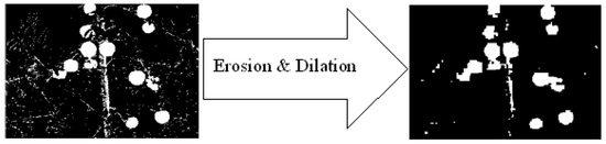The algorithm result is a binary image with major fruit detected and small clusters of pixels that were wrongly classified as fruits (e.g., Figure 8). In addition, some fruits were split between several clusters (e.g., Figure 8). To overcome these problems, several morphological operations were performed based on previous research that indicated their contribution [19]: erosion followed by dilation with a neighborhood of 11 × 11-pixel squares. The square function was used since there was no pre-defined knowledge about the expected fruit orientation. To connect close clusters, the closing morphological operation was then applied by dilation followed by erosion implemented with a 5 × 5-pixel square neighborhood.