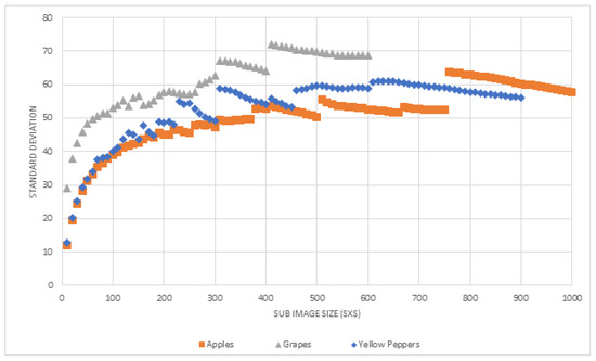 The algorithm split an image into sub-images until the sub-image achieved a predefined Standard Deviation (STD) value. This approach assumes that a larger sub-image contains a higher STD value. To test this assumption, STD was calculated for different sizes of sub-images for the different databases. The stop condition value (STD minimum value) was determined by maximizing the F-score (Equation (4)).