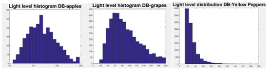 The light level distribution was computed for each database (Figure 12) along with T1 and T2 (Table 2). The variation in the light distributions between the different databases are described in Table 3. The variance of light in the grape databases was significantly higher than in both the apple and the pepper databases, the pepper database being significantly darker and highly skewed. Therefore, for each database, the selected T1 and T2 were significantly different, implying the importance of the tuning procedure.