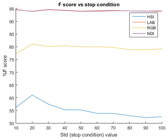Results (Figure 14) revealed that NDI and LAB color spaces resulted in similar best performances. In Table 5, the preferences for each dimension in the NDI color space and the performances when using the intersection between them is shown. The NDI first dimension (see Equation (1)) represents the difference between the red and green colors in the image. The objects in this database were red apples, and most of the background was green leaves; therefore, as expected, the first NDI obtained the best F of 93.17%. In the LAB color space, results (Table 5) revealed that the second dimension (A) yielded the best F-score of 93.19.