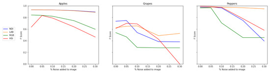 Analysis showed that the algorithm was robust to noise in the image up to 15% in the apple and pepper databases (Figure 15). The grape images were more sensitive to noise, and performance dropped when noise values of 5% were added. Although better F-score values were obtained for NDI and HSI for grapes and peppers, we can see that the LAB color space yielded more robust performance when adding noise to the images.
