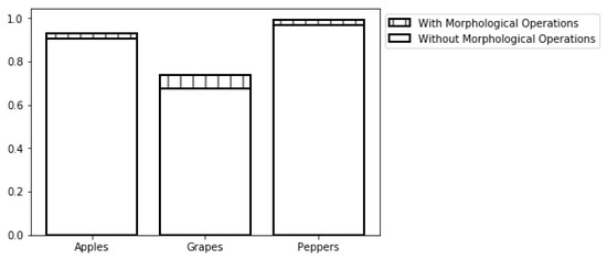 The morphological operations process increased the F-score by 2.85%, 8.59%, and 2.71% for the apple, grape, and pepper databases respectively, (Figure 17).