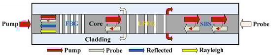 The basic principle of the hybrid BOTDA/XFG sensor is shown in Figure 1. A pulsed pump light and a continuous wave probe light can be used for a BOTDA-based sensor. At the same time, these counter-propagating lights may also be used as the light source for a reflection-based FBG sensor and a transmission-based LPFG sensor, respectively. In order to realize hybrid sensing, two key problems should be solved. One is the intensity adjustment that is required to pump light into both the BOTDA sensor and the XFG sensor simultaneously. The other is multiplexing and demultiplexing to avoid interference between the stimulated Brillouin signal and the XFG signal.