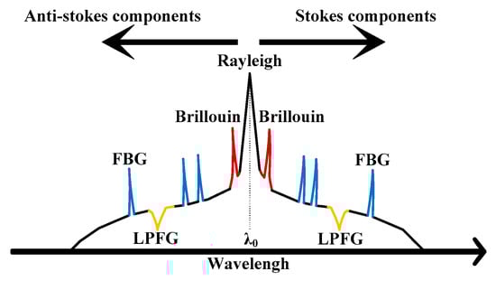 In order to avoid interference between the SBS signal and the XFG signal, the working wavelength of the XFG sensor should be located beyond (λas, λs). Taking the basic parameters of the optical fiber and the ambient strain/temperature changes into consideration, the maximum wavelength shift of the SBS signal from incident light (λ0) is usually 100 picometers. When measuring stain or humidity, the reflected light from the FBG sensor and the transmitted light from the LPFG sensor can spread over a wavelength range of tens of nanometers, with the central wavelength near λ0. Once there is no overlap between the wavelength of the SBS light signal and the working wavelength of the FBG reflected light signal and the LPFG transmitted light signal, both the distributed strain/temperature and the pointed dynamic strain or humidity can be measured by using the wavelength-division multiplexing technology. The spectral distribution of the hybrid BOTDA/XFG sensing technique is schematically shown in Figure 2.