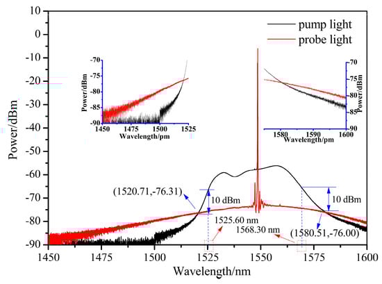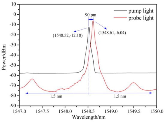 The emission spectrum of the hybrid system was measured by an optical spectrum analyzer (OSA) (ANDO AQ6317C) from 1450 to 1600 nm, as shown in Figure 4. From Figure 5, it can be seen that the probe light’s wavelength is 1548.610 nm, while pump light’s wavelength is 1548.520 nm. The spectral separation between the pump and probe light in this experiment is 90 pm (~10.84 GHz) when pumping at 1548 nm, which is approximately in agreement with the result observed in the Brillouin frequency spectrum.