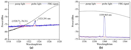 The pump light and probe light have equal power at the wavelengths of 1520.71 and 1580.51 nm. When the wavelength is located at 1450–1520.71 nm and 1580.51–1600 nm, the power of the probe light is higher than that of the pump light. In contrast, the pump light has higher power than the probe light between 1520.71 and 1580.51 nm. As we know, the XFG sensors in an optical system feature a wavelength filtering function, so avoiding overlap with the working wavelength for the BOTDA sensor’s measurement is needed. As shown in Figure 5, 1.5 nm of red-shift and blue-shift are suggested from 1548.52 nm (the pump light wavelength) and 1548.61 nm (the probe light wavelength), respectively, to minimize the interference of BGS. At the same time, considering the superposition of the reflected and transmitted signals of the XFG sensor and the direct probe signal in the measured spectrum, the wavelength with a power difference (nearly 10 dB, see Figure 4) between the pump light and the probe light is needed. This has been verified in Figure 6, which demonstrates that an obvious difference exists in the SNR of the XFG sensor that is dependent on the power difference between pump light and the probe light. In summary, the wavelength for XFG interrogation is suggested to be located at 1525.60–1547.02 nm and 1550.11–1568.30 nm to obtain a better SNR.