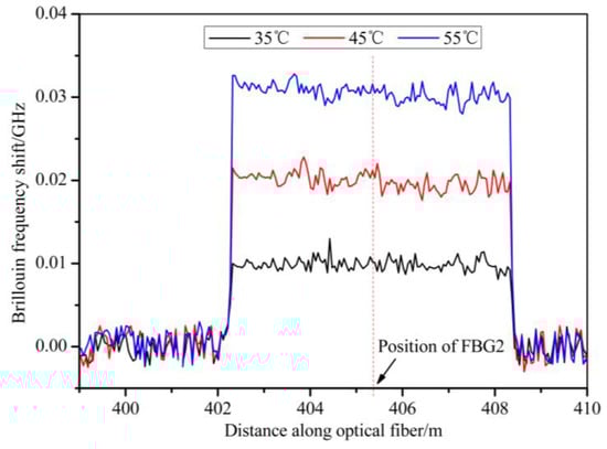 The distributed temperature was measured along the fiber, of which 6 meters was placed in a TCC and the rest kept at room temperature. Then, the influence of an FBG sensor on BOTDA-based distributed measurement was studied. Figure 7 shows the Brillouin frequency shift of the fiber with different temperatures. In this experiment, the temperature of the TCC was set to be 35 °C, 45 °C, and 55 °C from room temperature. As shown in Figure 7, the distributed temperature measurement is almost not influenced by the FBG sensor. This was attributed mainly to the center wavelength of the FBG sensor being far away from the working wavelengths of both the incident light and SBS signal and the DWDM used as a Brillouin filter.