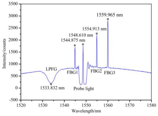 Figure 8 shows the measured spectrum of the XFG sensors, which include one LPFG sensor and three FBG sensors, with different center wavelengths. The LPFG sensor is centered at 1533.832 nm, while the three FBG sensors are respectively centered at 1544.875 nm, 1554.913 nm, and 1559.965 nm. Due to the DWDM, the SBS and Rayleigh signals are separated to avoid spectral crosstalk. The XFG signals are superimposed by the probe’s incident light, which has been significantly attenuated using the DWDM and the subsequent band-pass filter to avoid detector saturation in the FBGA. This validates the multiplexing of the XFG sensors in a single fiber. It also proves that, in the hybrid system, the Bragg reflected signal, the LPFG transmitted signal, and the Brillouin scattering signal do not interfere with one another.