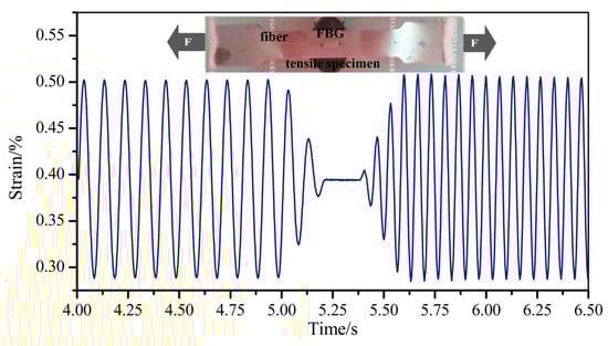 Dynamic strain measurements were also carried out. As shown in Figure 9, a metal tensile specimen (300 mm in length and 30 mm in width) was made for a dynamic strain test. FBG3 with a bonding length of 20 mm was fixed to the middle part of the surface using a liquid epoxy resin adhesive. Then, the specimen was loaded with 10 Hz and 15 Hz sinusoidal strain waveforms (2900–5000 µε) sequentially in the MTS universal testing machine. Figure 9 shows the dynamic strain in the time domain. As shown, the dynamic response is in agreement with the two different sinusoidal traces. The loading and unloading processes can also be identified clearly. The dynamic strain can be well-measured by this hybrid system.