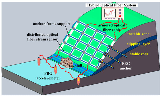 In order to determine the steady state of a slope, early detection is essential. Decreases in a slope’s stability are often accompanied by surface and subsurface deformation, increases in the stress on the reinforcement, variation in soil moisture, and rockfall occurrences. Multiparameter monitoring is critical for a landslide warning system to function correctly and in real-time since it can provide more information. Therefore, a scheme for multiparameter monitoring of slopes is developed using the proposed hybrid system, which can monitor static and dynamic information simultaneously. As illustrated in Figure 10, an anchor-frame girder with an embedded optical fiber sensor is designed to monitor surface deformation and anchor force change due to subsurface deformation. At the same time, an optical fiber accelerometer is also introduced to detect vibrations induced by rockfall.