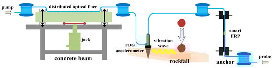 Based on the developed scheme, proof-of-concept experiments have been carried out using the proposed hybrid sensor to verify its feasibility for monitoring multiple parameters of slopes simultaneously. Figure 11 shows the schematic diagram of the simulated experimental system, which contains three parts. The first part simulates the surface deformation of a slope with a distributed fiber sensor bonded to the surface of a concrete beam. Here, we utilized a jack load to replace the push force induced by a landslide. Surface deformation of a concrete beam was studied using a four-point bending test. In the second part, a smart FRP rod [49] with an embedded FBG sensor was loaded using a universal testing machine to simulate variations in the axial force of an anchor reinforcement in a slope. Stones falling from a higher level were used to simulate rockfall on a slope in the third part, where a previously designed FBG accelerometer [50] is adopted to obtain rockfall vibrations. At the same time, a metal nail was used to couple the FBG accelerometer and the surrounding soil or rock.