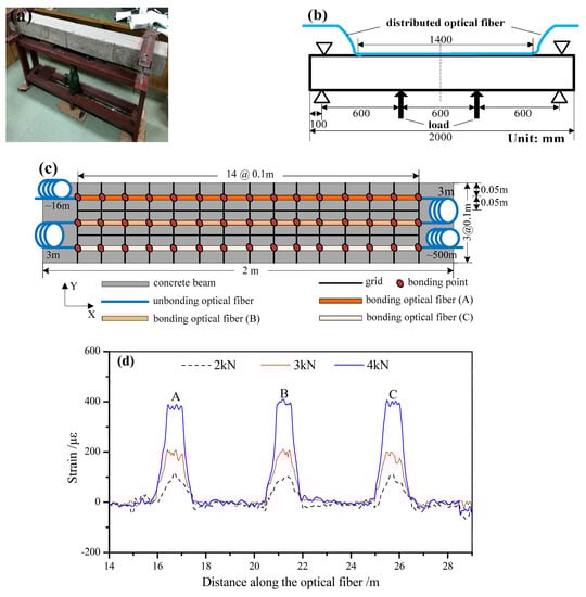 As shown in Figure 12a, an approximate four-point bending test with a distributed optical fiber point-bonded onto the surface of a concrete beam was carried out to simulate variation in frame beam strain induced by surface deformation of a slope. The test was conducted using load control, in which a hydraulic jack and a force sensor are utilized to load a beam and measure loads, respectively. Three load levels were considered: 2 kN, 3 kN, and 4 kN. The dimensions of the test setup are shown in Figure 12b. Figure 12c shows the layout of the distributed optical fiber sensors as well as the subareas of the concrete beam. For ease of reference, the three portions of the point-bonded optical fiber sensor are marked by A, B, and C.