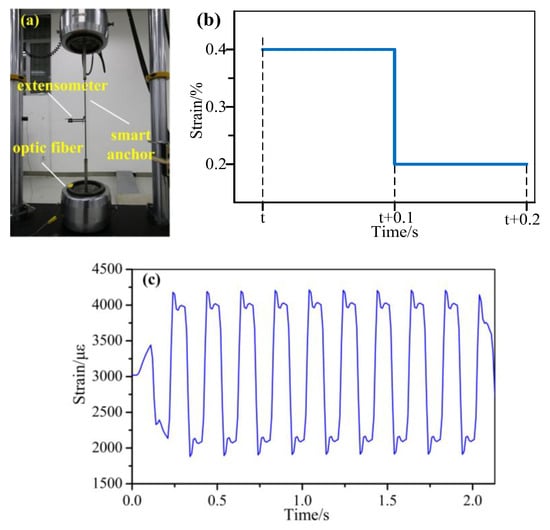 Measurement of the dynamic strain on the anchor: (a) the test setup; (b) the load with a square waveform applied to the anchor; (c) the measurement results of the dynamic strain on the anchor.
