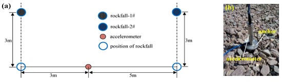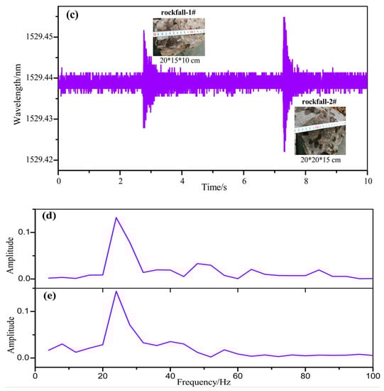 Measurement of rockfall vibration: (a) a schematic diagram of the experiment; (b) a photo of the fiber Bragg grating (FBG) accelerometer; (c) the vibration signal measured in the time domain; (d) the frequency response of rockfall-1#; (e) the frequency response of rockfall-2#.