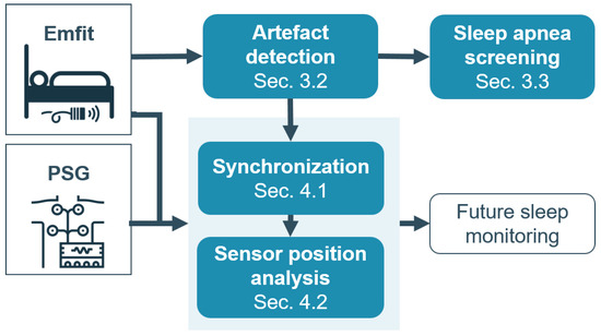 Overview of study objectives. First, the potential of the Emfit sensor for sleep apnea screening was investigated by searching for artefacts in the data caused by arousals and chest motions. Secondly, the study explored the suitability of this commercial sensor to be merged with gold standard polysomnography data for future sleep monitoring. Therefore, an automated synchronization procedure based on the previously detected artefact patterns was developed. After synchronization, the optimal position of the Emfit for capturing respiratory and cardiac information was identified.