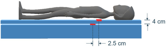 In this study, two setups of the sensor were investigated. The bed consisted of a mattress on top of which a mattress topper of approximately 4 cm thickness was added. One sensor was positioned underneath the thorax of the patient, separated by the mattress cover (position Top). A second sensor was placed beneath the topper (position Bottom) at a 2.5 cm horizontal distance to the top sensor (see Figure 2). The horizontal distance ensured the limiting of the influence of the top sensor and compensated the effect of patients moving down in the bed when lifting the head of the mattress upwards. This setup was applied simultaneously in two beds in the sleep laboratory.