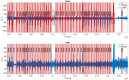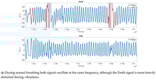 Detailed examples of an Emfit signal with detected artefacts and (synchronized) PSG thoracic belt are displayed in Figure 8. Shaded intervals present apneic events and detected artefacts are indicated in red. Figure 8a illustrates that during normal breathing, both signals oscillate at the same frequency, although the Emfit signal is more heavily distorted during vibrations. Figure 8b shows artefacted segments following obstructive apneas (Aobs), suggesting the ability of the algorithm to capture apneic arousals and corresponding motions. Furthermore, Figure 8c displays artefact segments around 9450 s, which are not related to an apneic event and can be assigned to generic body movements. However, during [9500, 9700] s, obstructive hypopneas (Hobs) took place after which no artefacts were detected (except one). In this example, the reduction in ventilation is hardly captured in the Emfit signal.