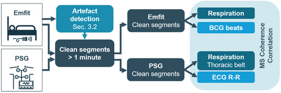 After synchronization of the Emfit with the PSG, the quality of the sensors was analyzed. The top sensor was expected to have a larger BCG signal quality, while the signal captured by the bottom sensor was attenuated by the mattress topper. The latter could lead to a better signal quality if many movement artefacts were present and for patients with an increased BMI. Without the attenuation, the signal would otherwise saturate. In a first phase, clean segments were extracted from the signals (see Figure 6). Based on the detected artefacts in the Emfit signal, segments of at least 1 min without an artefact were considered. These segments were compared to the corresponding segments from the PSG based on magnitude-squared (MS) coherence and correlation. Based on these statistics, the ability of the top and bottom sensors to capture heart rate and respiration information was assessed.