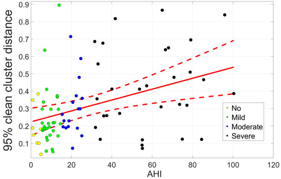 As explained in Section 3.3, the cleanness of the clean segment cluster was inspected for every subject. For this, the 95th percentile of distance to the clean cluster centroid was derived. A linear regression of this metric with AHI is depicted in Figure 9. The regression displayed an upward trend; however, only a limited coefficient of determination of 0.16 was obtained.
