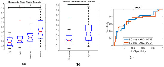 The distance metric was also analyzed for standard sleep apnea classes of subjects, as shown in Figure 10, where the area under the curve (AUC) is defined of the receiver operating characteristic (ROC) curve. This also indicated a trend towards larger distances within the clean cluster and hence less regularity in the signal with increasing AHI. A Kruskal–Wallis test with Bonferroni correction between apnea classes indicated a significant difference () between no and mild apnea versus severe apnea. Furthermore, a significant difference (Mann–Whitney U test, ) was found between patients with AHI and 15 ⩽ AHI. The ROC curve in Figure 10c displays the ability of screening of severe apnea patients (AHI ), where a sensitivity of 0.77 and specificity of 0.62 was reached. The ROC curve for more generally defined apnea patients (AHI ≥ 15) reaches a sensitivity of 0.72 and specificity of 0.70. As a screening measure, a value of 0.229 for the 95th percentile of distance to the clean cluster centroid was taken.
