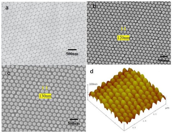 Here, the reducing rate of PS spheres is smaller than that of silicon. PS spheres were used as a mask and were reduced by plasma bombardment. As a result, the nanoscale pattern with PS sphere was transferred to form a silicon pillar array. In the next process, the substrate was put into a tetrahydrofuran (THF) solvent to remove all of the PS spheres.