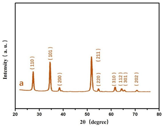 Figure 1a shows a scanning electron microscopy (SEM) image of the ordered PS sphere array. The periodic single layer PS sphere array was fabricated on a silicon wafer, which displayed a classic honeycomb, close-packed structure with a period of 220 nm (PS sphere diameter). Figure 1b shows an SEM image of the Si nanopillar array. The diameter of the pillar was approximately 120 nm. This demonstrates that the honeycomb, close-packed structure was well transferred from the PS sphere to the silicon wafer surface. As shown in Figure 1c, the SnO2 film was deposited onto the silicon nanopillar array. The surface morphology of the silicon nanopillar array with SnO2 was maintained without decomposition. The size was 130 nm, which was bigger than the fresh silicon nanopillar array. Figure 1d is an atomic force microscopy (AFM) image of the silicon nanopillar array with SnO2 film. It demonstrates the oblique view of the silicon nanopillar array with SnO2 film. The height of pillar was approximately 110 nm. The X-ray diffraction patterns of the SnO2 film are shown in Figure 2. These indicate that a SnO2 film with a crystalline property was homogeneously deposited on the Si nanopillar array.