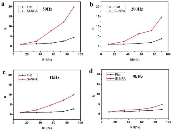 In our case, the capacitance response was measured under four different frequencies—50 Hz, 200 Hz, 1 kHz, and 5 kHz. The SnO2/silicon nanopillar array humidity sensing activity was studied with UV light irradiation. As a point of comparison, the SnO2 film on the flat surface silicon wafer (SnO2/Si) was also studied. Here, the humidity response R is defined as: