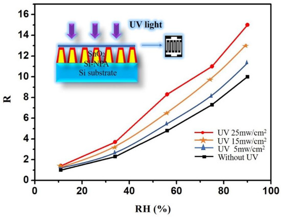 To improve humidity sensitivity, UV-activated irradiation was carried out. These measurements were studied in a quartz glass under UV light irradiation at room temperature (25 °C). UV light was provided by a light-emitting diode (LED). Considering both the linearity and the response of the abovementioned studies, the applied frequency was 1 kHz. The humidity responses with and without UV are shown in Figure 4. The inset illustrates the schematic diagram of the SnO2/silicon nanopillar array sensor with UV light. Three different power intensities (25 mW/cm2, 15 mW/cm2, and 5 mW/cm2) of UV light with a wavelength of 300 nm were applied in our work. As shown, increasing power produced a greater response. The optimal response was obtained with 25 mW/cm2. The response increased across the entire testing RH range with UV light. Table 1 shows the outcome of the humidity response with UV (25 mW/cm2) and without UV. As can be seen from Table 1, the increase was 20% at 11% RH. In the other case, the increase was approximately 50%. The maximum response increase was 58% at 56% RH.