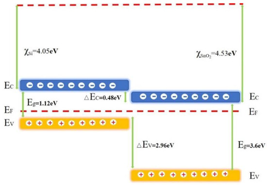 These additional photoinduced oxygen ions are combined with water molecules by covalent bonds (Figure 5d). Figure 6 shows the energy band diagram of the nanostructure of SnO2/Si according to the Anderson model. EF is the Fermi level position, Ec and Ev are the conduction and valence band edge, Eg is the band gap, △EC and △EF are the band discontinuities, χSi and χSnO2 are the electron affinity energies of Si and SnO2. Under UV irradiation, SnO2 and Si absorb photon energy to generate electrons and holes. As χSi is smaller than χSnO2, the electrons flow from the Si conduction band to SnO2. The process was enhanced as more electrons appeared on the surface of SnO2. Therefore, more water molecules were absorbed with UV irradiation to condense liquid water than without UV. It was found that the sensor capacitance raises rapidly to improve the humidity sensitivity.