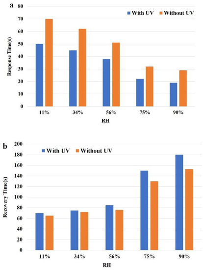 The response and recovery time of the sensor was also measured. C is the instantaneous capacitance of this SnO2/silicon nanopillar array sensor, and C0 is either the final or initial value. The response time is defined as the time taken to go from C/C0 = 0% to 90%. The recovery time is defined as the time taken to go from C/C0 = 100% to 10%. Here, the response and recovery times were measured by switching the humidity between RH = 11% and 90% under the frequency of 1 kHz. Figure 7 shows the response and recovery time under RH = 90%. With UV, the response time was 19 s and the recovery time was 180 s. Without UV, the response time was 28 s and the recovery time was 155 s. Furthermore, Figure 8a and Figure 8b show the response and recovery times when the relative humidity switches from 11% RH to 34%, 56%, 75%, and 90%, respectively. Both with and without UV irradiation, the response time decreased with the increase of humidity. However, the recovery time increased with the increase of humidity under UV irradiation. This is mainly because more water vapor condenses liquid water on the surface of SnO2/silicon nanopillar array at the same time under a high RH, but the liquid water becomes more difficult to desorb with the increase of humidity. The fastest response time was 19 s at 90% RH with UV and the fastest recovery time was 65 s at 11% RH without UV. Table 2 summarizes the humidity sensing performances of our work and other humidity sensors reported. It notes that the performances of our sensors are significantly superior to others, not only in terms of sensitivity but also in response and recovery times.
