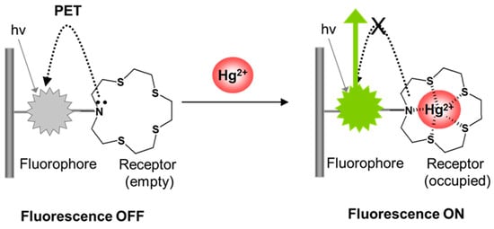 Illustration of fluorescence switching on by Hg2+ binding via a photoinduced electron transfer (PET) mechanism.