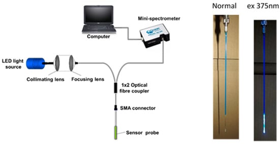 The set-up used for the measurements undertaken to calibrate the probe is as presented in Figure 2, where light from a 3 mW LED (Roithner Lasertechnik), emitting at a center wavelength of 375 nm is coupled through a multimode UV/Visible fibre (with hard polymer cladding, 1000 µm silica core and numerical aperture NA of 0.37, Thorlabs), using collimation and focusing lenses (Comar), into one branch of a 2 × 1 multimode fibre coupler (Ocean Optics). The other end of the fibre coupler is connected, through a SMA connector, to the sensor probe with the active sensing region being located at the distal end of the fibre. Following interaction of Hg2+ with the active region, a portion of the total light emitted from the sensing layer is collected and guided through the other end of the fibre coupler to an Ocean Optics USB2000 spectrometer, the output from which is then displayed on a computer screen.