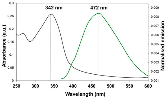All chemicals were of analytical grade, purchased from Sigma-Aldrich and were used without further purification. All solvents used were of HPLC grade from Fisher Scientific. All aqueous solutions were prepared using distilled deionized water. 1H and 13C NMR spectra were recorded on a Bruker Avance Neo 700 or a Bruker Avance 500 spectrometer. Mass spectra were run by the positive ion electrospray (ES) mode on an Agilent LC connected to an Agilent 6510 QTOF mass spectrometer or electron ionisation (EI) mode on a Thermo Finnigan MAT900xp mass spectrometer. IR spectra were recorded on a Bruker Alpha Fourier transform infrared spectrophotometer and were run neat. Melting points were recorded using a Stuart SMP30 melting point apparatus and were uncorrected. Absorption and fluorescence measurements of aqueous solutions containing fluorophores were carried out on a PerkinElmer Lambda 35 spectrophotometer and a Horiba Jobin Yvon Fluoromax-4 spectrofluorometer system with FluorEssenceTM as the driving software, respectively. Refractive indices were measured on an Abbe refractometer. Quantum yields of fluorescence were determined using quinine sulfate as the standard (Φ = 0.55) [,].