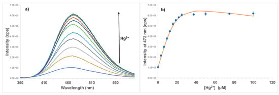 Adding Hg2+ to STAMC in the solution resulted in a significant increase in fluorescence intensity of the fluorophore. Figure 4 shows the changes in fluorescence of STAMC with different concentrations of Hg2+. It can be seen that the emission intensity at 472 nm increases sharply, nearly 6-fold after the addition of only 25 µM (0.5 equivalent) of Hg2+. No significant change was observed after further addition of Hg2+, indicating that an approximate saturation was reached. This suggests that the interactions of the fluorophore with Hg2+ are very strong, but not on a 1:1 basis, rather on a 2:1 basis.