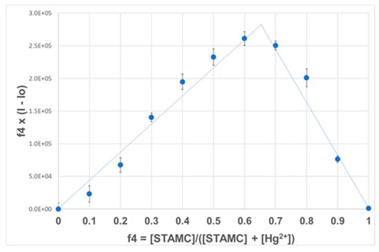 The binding stoichiometry of STAMC and Hg2+ was determined using Job’s method of continuous variation []. The total concentration of STAMC and Hg2+ was maintained constant at 50 µM, with a continuous variation of the molar fraction of STAMC. Figure 5 shows the fluorescence intensity variation at 472 nm as a function of f4 (f4 being the fraction of STAMC, 4 in a fixed total concentration ([STAMC] + [Hg2+] = 50 µM). The sharp peak in the plot at f4 = 0.67 confirms that the dominant species is the 2:1 complex, which is also in agreement with the titration data.